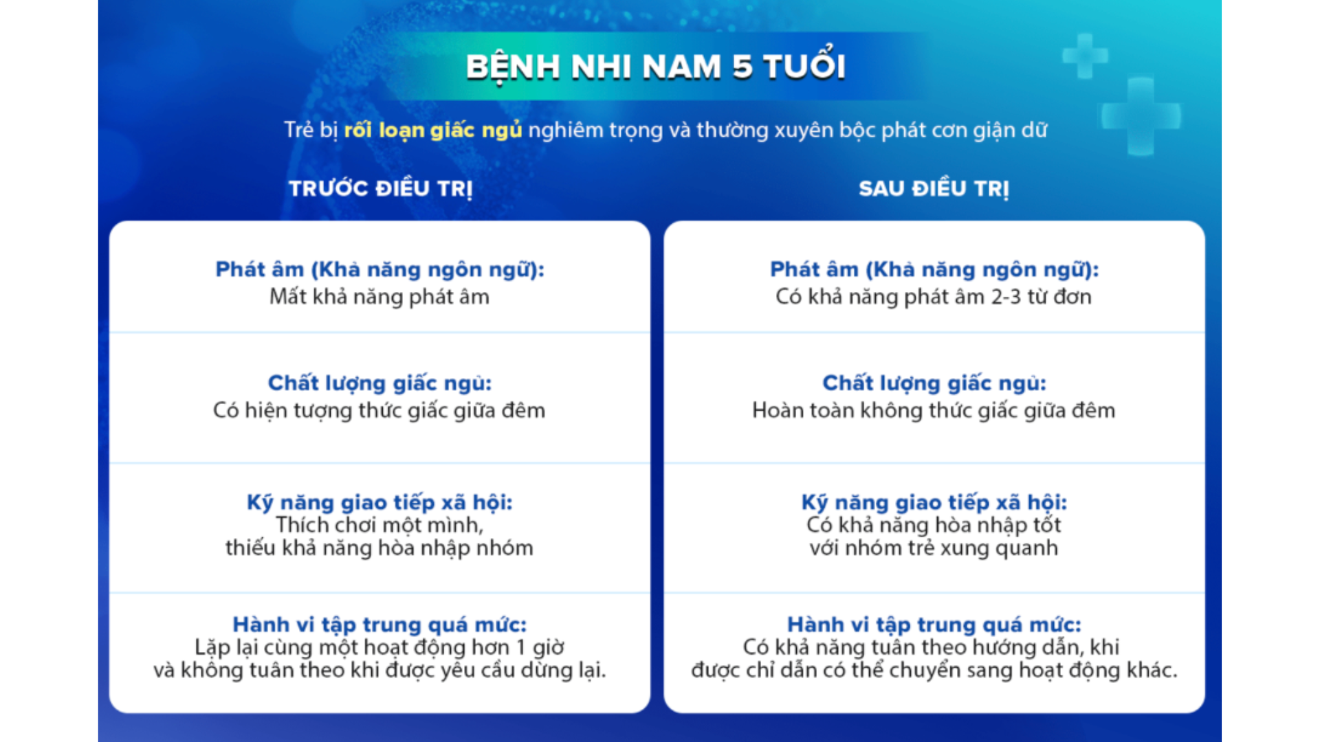 Một trường hợp điển hình là bé trai 5 tuổi, trước đây thường xuyên la hét, phá phách và có hành vi bạo lực với cha mẹ do không thể ngủ vào ban đêm. Sau khi được điều trị bằng liệu pháp tế bào gốc Nhật Bản, các triệu chứng này gần như biến mất. Bé đã có thể ngủ ngon, duy trì giấc ngủ xuyên đêm, tâm trạng ổn định hơn.