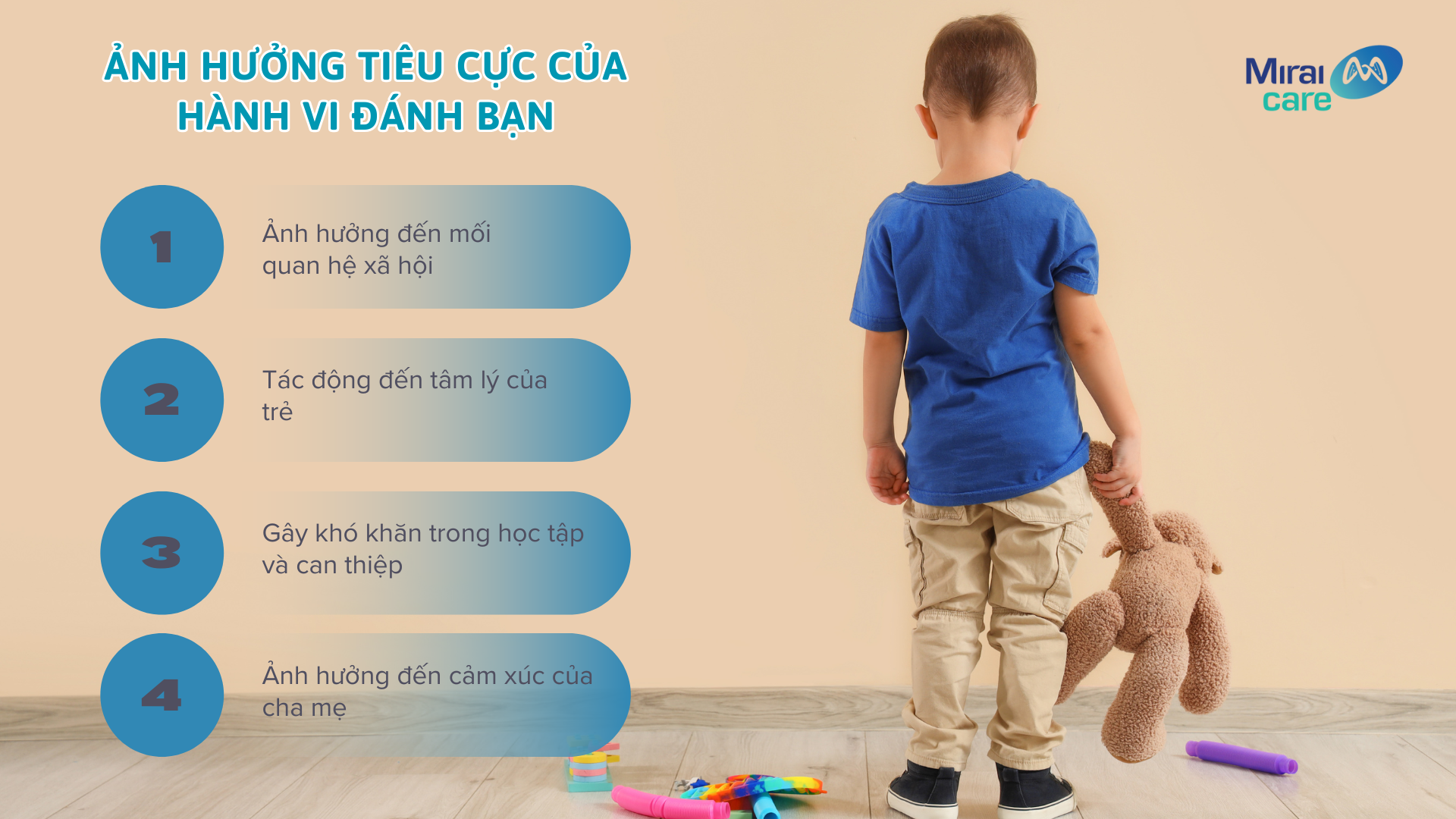 Hành vi đánh bạn ở trẻ tự kỷ không chỉ gây lo lắng cho cha mẹ mà còn ảnh hưởng đến nhiều khía cạnh trong quá trình phát triển tâm lý – xã hội của trẻ. Dưới đây là những tác động tiêu cực thường thấy: